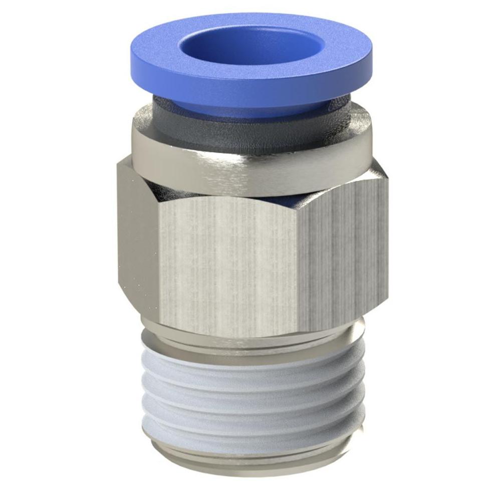 - De rechte steekverbinding "Blauwe serie" met R-buitendraad dient voor de directe, rechte verbinding van persluchtslangen met conische schroefdraadaansluiting in pneumatische systemen.