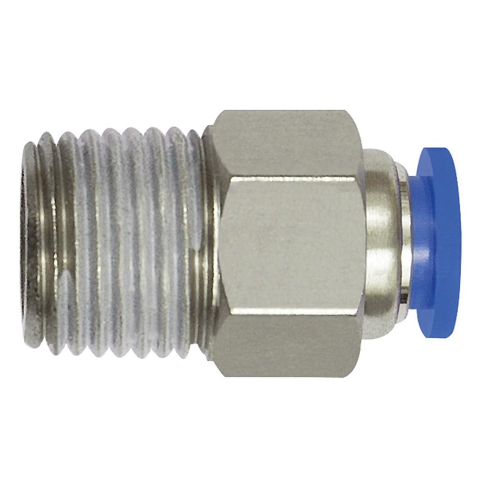 - De rechte steekverbinding "Blauwe serie" mini met R-buitendraad dient voor de rechte aansluiting van persluchtslangen met een buitendiameter van 4 mm op pneumatische aansluitingen.