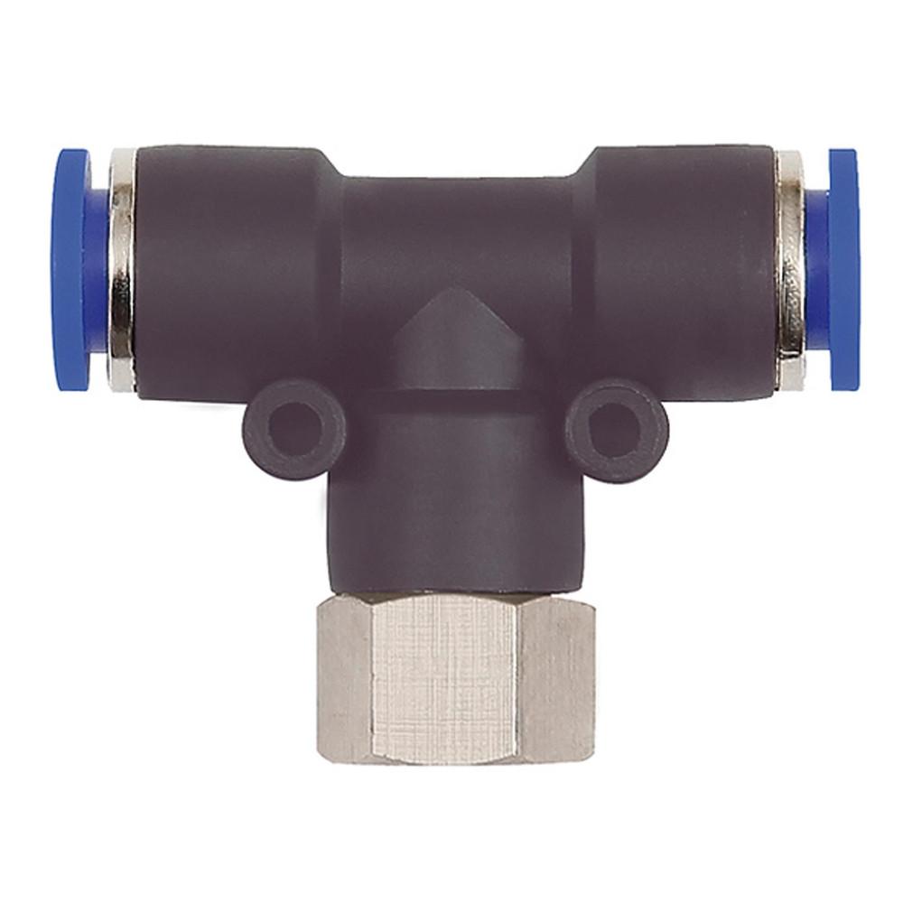 - De T-steekkoppeling is geschikt voor de distributie van perslucht in pneumatische installaties wanneer een slangaansluiting via een binnendraad moet worden aangesloten.